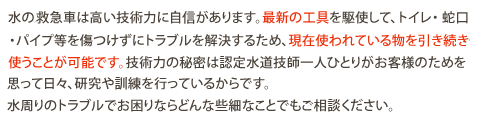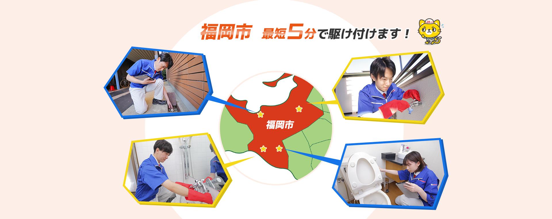 福岡市でトイレつまりや水漏れの迅速な解決をお求めなら、『水の救急車福岡店』が最短5分で対応します。博多の活気ある街並みを守るように、365日、プロフェッショナルな技術で水回りのトラブルを解決いたします。